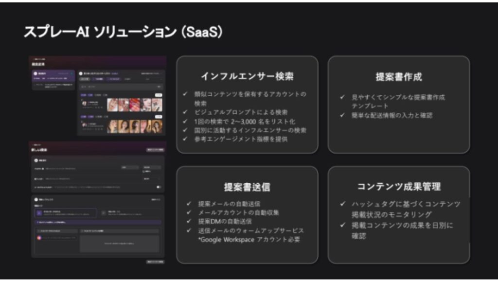 その後、より積極的にマーケティングを支援するツールとして開発したのが、グローバルクリエイターマーケティング向けのAIソリューション「Spray」です。