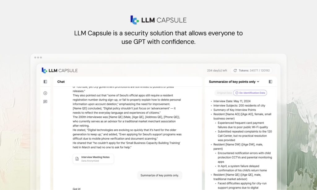 また、弊社の「LLM Capsule」は、ChatGPTなどの生成型AIを使用する際に、顧客の個人情報や会社の機密情報が外部に漏洩しないように保護する機能も備えています。