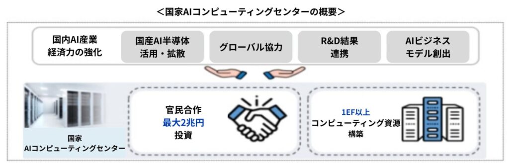 特に韓国内外のAI半導体を組み合わせ(国産半導体比重50%目標)、2030年までに計1エクサフロップス(EF・1秒に100京回の浮動小数点の演算処理能力)級のコンピューティング資源を確保し、企業・公共などにAIインフラを支援しなければならない。2045年までにAIコンピューティングサービスを安定的に供給するためのサービスの構成案・課金体系なども提示する必要がある。