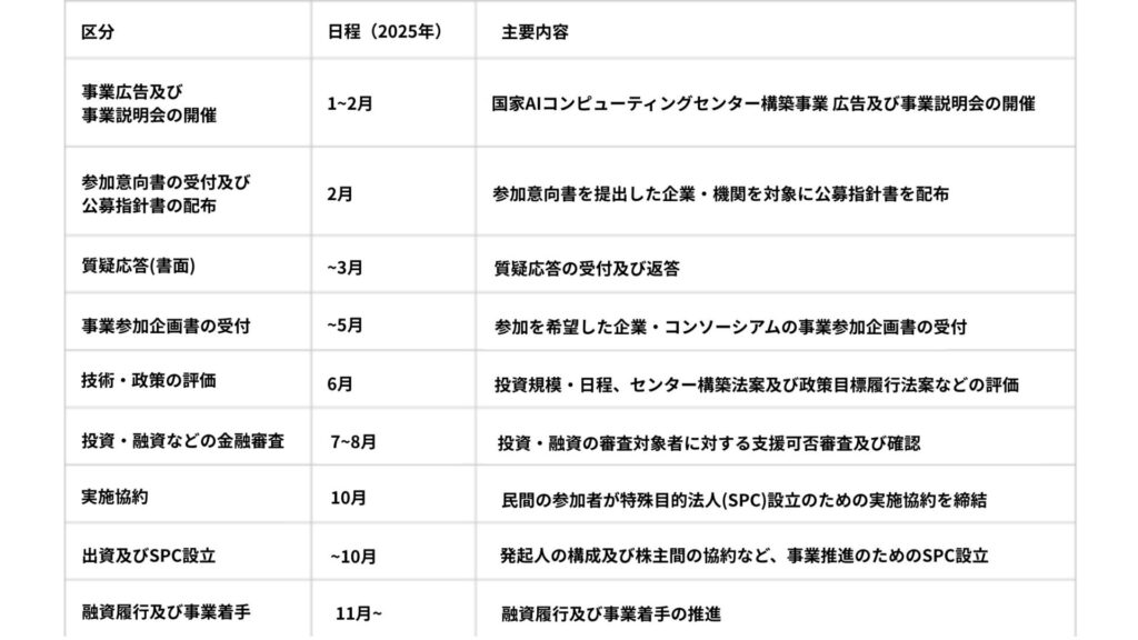 国家AIコンピューティングセンターの設立推進スケジュール(案)。出典:科学技術情報通信部提供の公募指針書 – 国家AIコンピューティングセンターの設立推進スケジュール(案)。出典:科学技術情報通信部提供の公募指針書