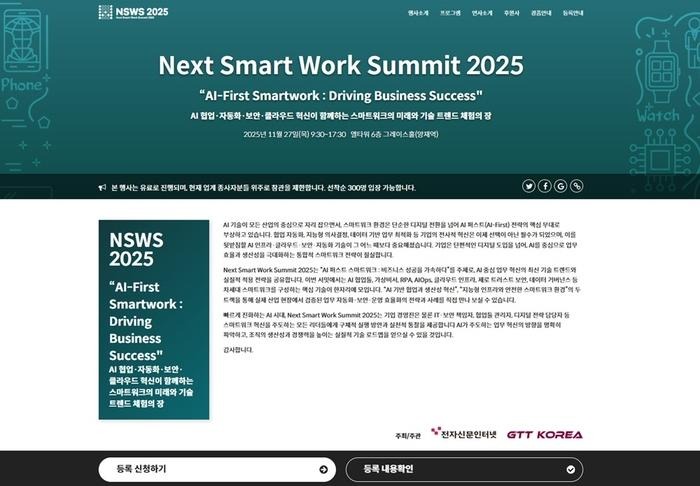 「電子新聞インターネット」と「GTT KOREA」が共催する「NSWS(Next Smart Work Summit)2025」では、スマートワーク環境関連のソリューションのグローバルリーダー企業が最新技術と市場動向、そして企業が直面する問題の解決策を深く扱う予定だ。今回のサミットでは、AIとスマートワークを活用した革新的な業務環境の構築と、活用戦略の共有とともに、展示ブースを通じて企業に必要な様々なスマートワーク活用法を具体的に体験できるコーナーも設ける。