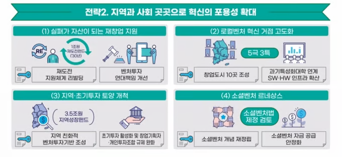地方・非首都圏スタートアップエコシステム支援にも力を入れる。代表的な策としては、3兆5000億ウォン(約3700億円)規模の「地域成長ファンド」を造り、ファンド・オブ・ファンズ出資予算の50%以上を地域に投資するようにした。非首都圏のスタートアップにはTIPS(ティップス)など政府支援事業インセンティブの適用を強化した。