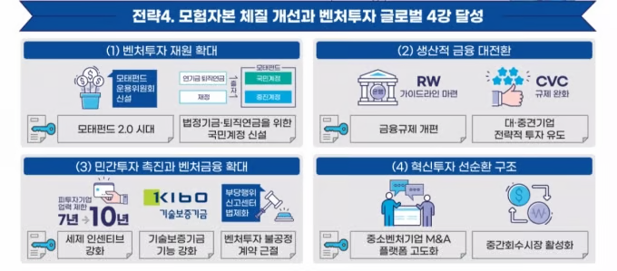 ファンド・オブ・ファンズが出資した「NEXT UNICORN PROJECT(ネクストユニコーンプロジェクトファンド)」を通じて、初期20億ウォン(約2.1億円)、中期100億ウォン(約10.5億円)を投資し、ユニコーン候補企業を選定、民間VC(ベンチャーキャピタル)、技術保証基金、海外VCなどから、600億ウォン(約64億円)以上を投資するなど、具体的な案が設けられた。TIPS(ティップス)など起業支援プログラムもAI・ディープテック中心に改編される。