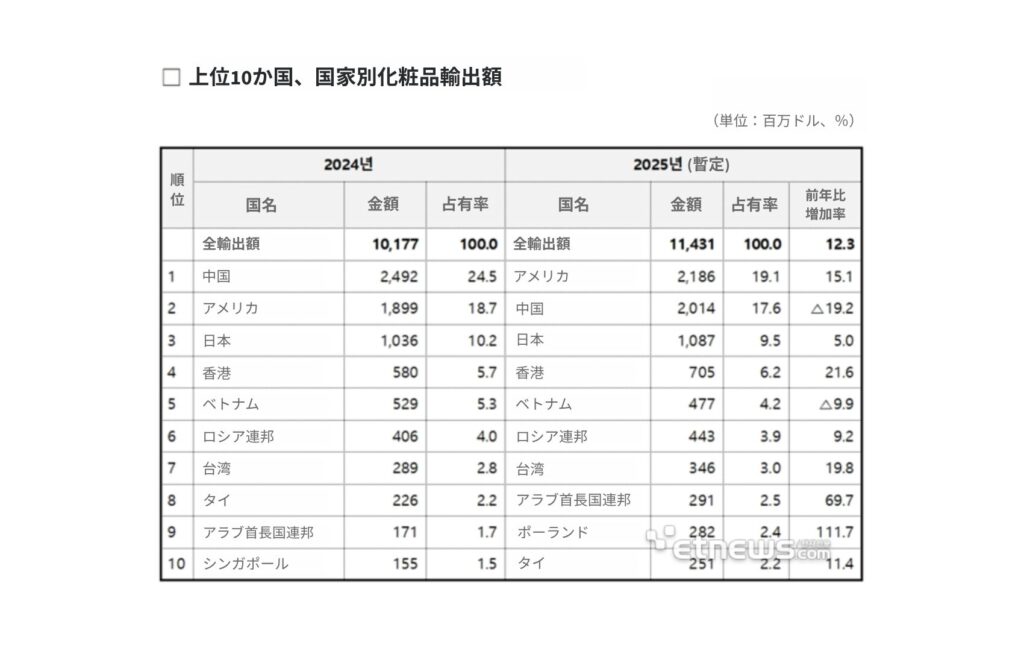 2024年及び2025年の上位10ヶ国の化粧品輸出額-出典:食品医薬品安全処