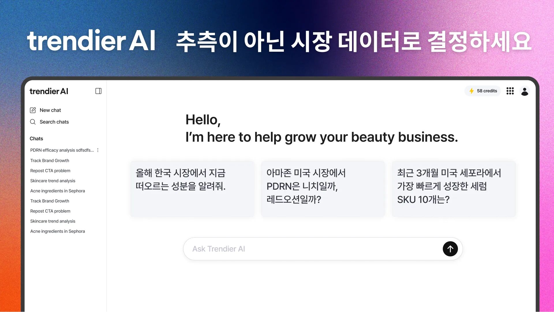 trendier AIは世界30以上のマーケットプレイスで収集した販売データ・消費者レビュー・供給変化量・価格構造などの産業データを基盤に動作する。汎用LLMが学習時点の一般知識でトレンドの要約を提供するのとは異なり、市場需要検証から実行戦略設計まで、一つの対話の中から導き出す仕組みだ。公式公開に先立って、年間売上高1,000億ウォン(約107億円)以上の上位K-ビューティー企業20チームを対象とした先行リリースの結果、反復的な市場調査業務時間が最大90%まで短縮されたことが分かったと明らかにした。