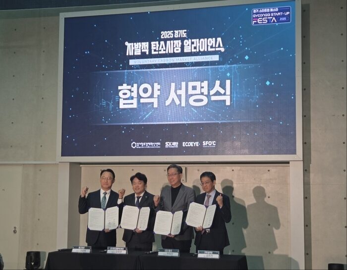 京畿(キョンギ)創造経済革新センター、SDX財団、EcoEye(エコアイ)、社団法人気候ソリューション(SFOC)は27日、板橋(パンギョ)第2テクノバレー企業支援ハブで「自主的炭素市場(VCM)アライアンス」の発足式と協約式を開催し、共に「韓国型自主的炭素市場」を造成するために協力することにした。