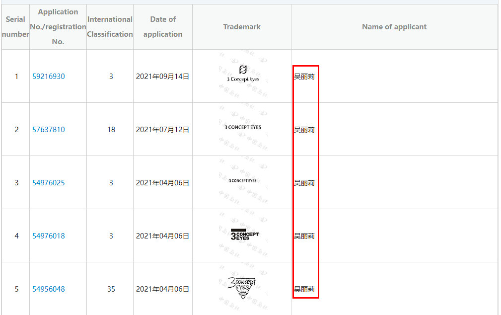 中国の第3者による「3 CONCEPT EYES」商標権の先取り状況