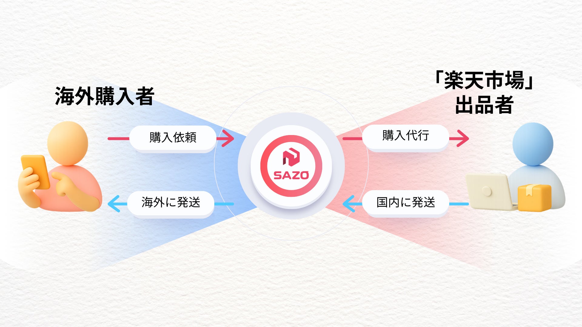 韓国ユーザーが「SAZO」(https://sazo.kr/)上で楽天市場の商品を購入すると、購入者に代わりSAZOが楽天市場の商品を手配します。楽天市場の出店者様は、SAZOの国内拠点へ商品を発送し、届いた商品をSAZOが購入者の元へ届けます。