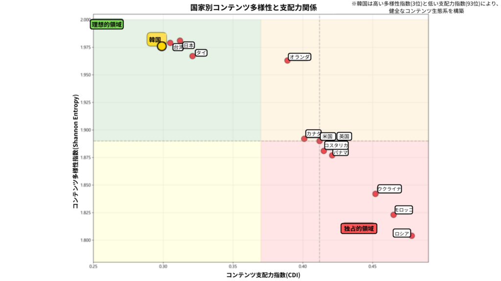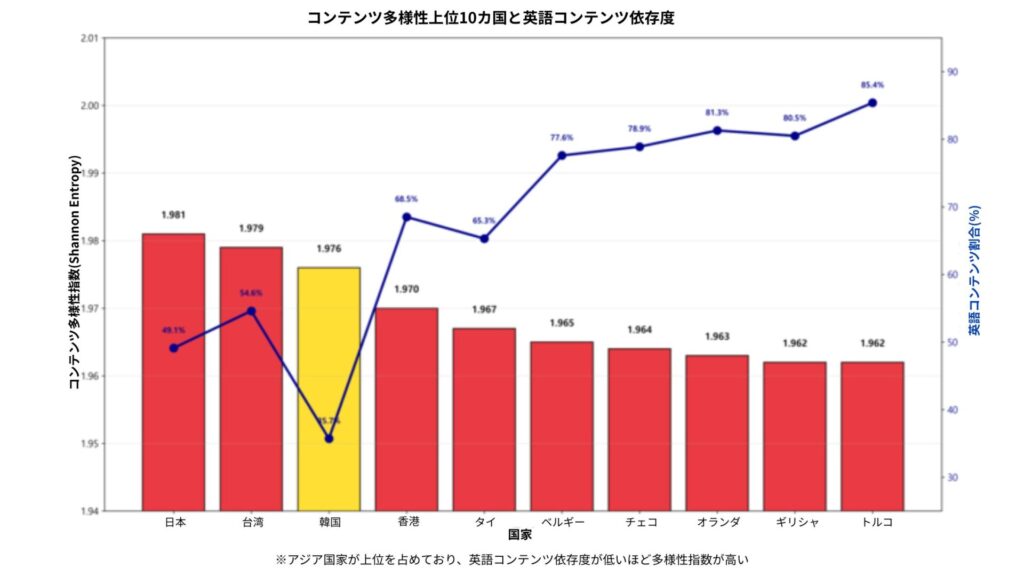 韓国のコンテンツ多様性指数(Shannon Entropy)は1.976で94ヶ国中3位だ。興味深いのは上位10ヶ国のうち5ヶ国がアジア国家だという点だ。日本(1位、1.981)、台湾(2位、1.979)、韓国(3位、1.976)、香港(4位、1.970)、タイ(5位、1.967)の順で、これらの共通点は英語コンテンツの依存度が低いということだ。韓国の英語コンテンツの比率は35.7%で全体の平均(66.3%)の半分程度だ。