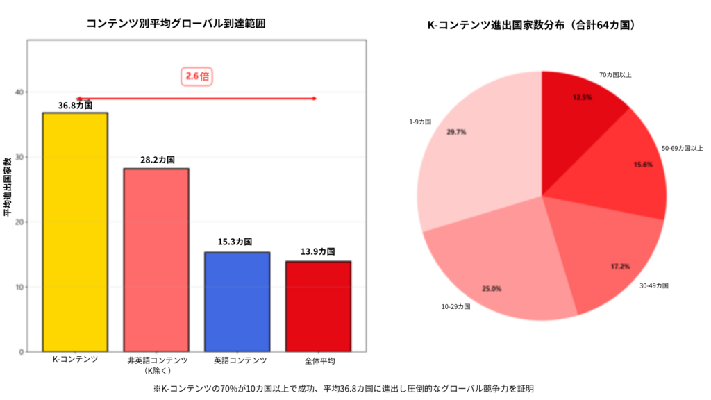 Kコンテンツは平均36.8ヶ国でトップ10に入った。コンテンツ全体の平均(13.9ヶ国)の2.6倍、非英語コンテンツの平均(28.2ヶ国)よりも30%高い数値だ。64作のKコンテンツのうち70%が10カ国以上で成功した点は、これが単純な「韓流ブーム」を越えた構造的競争力であることを示している。