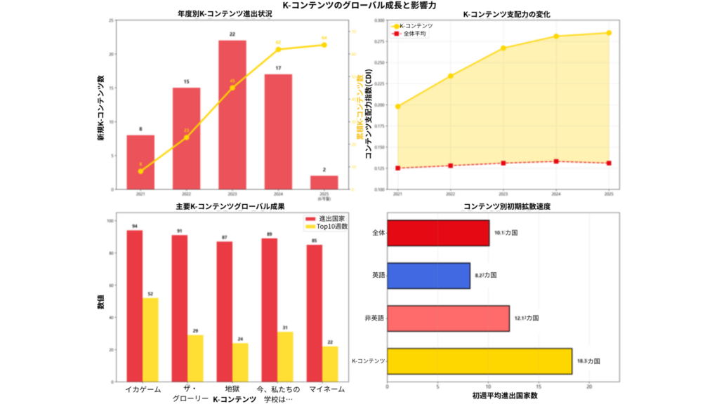 Kコンテンツの成功の秘訣は文化的特殊性と普遍性の絶妙な調和にある。 「イカゲーム」は、韓国の伝統的な遊びを通して世界の不平等を取り上げ、「ザ・グローリー」は校内暴力から出発し、復讐と正義という普遍的な情緒に触れた。初週の平均進出国数が2021年の7.0ヶ国から2025年には10.1ヶ国と44%増加したことは、こうした戦略の成功を立証している。