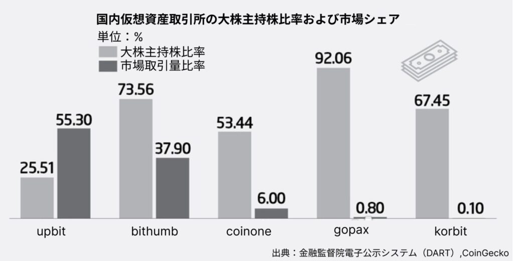 韓国の仮想資産取引所の大株主の株式率及び市場占有率