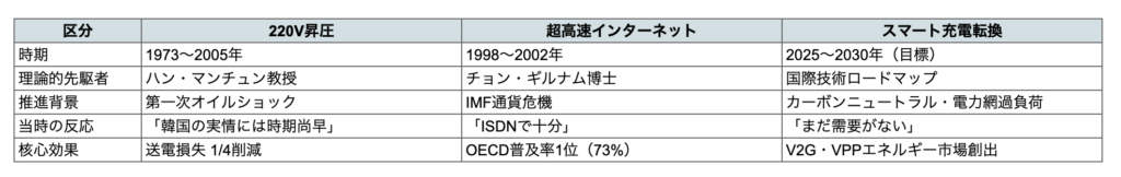 220V昇圧は「韓国の実情には贅沢」だった。超高速インターネットは「ISDNで十分」だった。スマート充電は「需要がまだない」だ。3つの反論の共通点は一つだ。全て間違っていた。