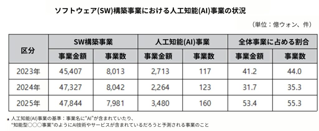 全SW構築事業4兆7,844億ウォン(約5,065億2,600万円)のうち、AI機能を含めて発注する事業比重は金額で7.3%、件数では全体の7981件のうち2.0%を占めている。公共・産業インフラの全面的なAI化、超巨大AIの行政導入など政府の計画により、公共AI事業は急速に拡大すると予想されている。