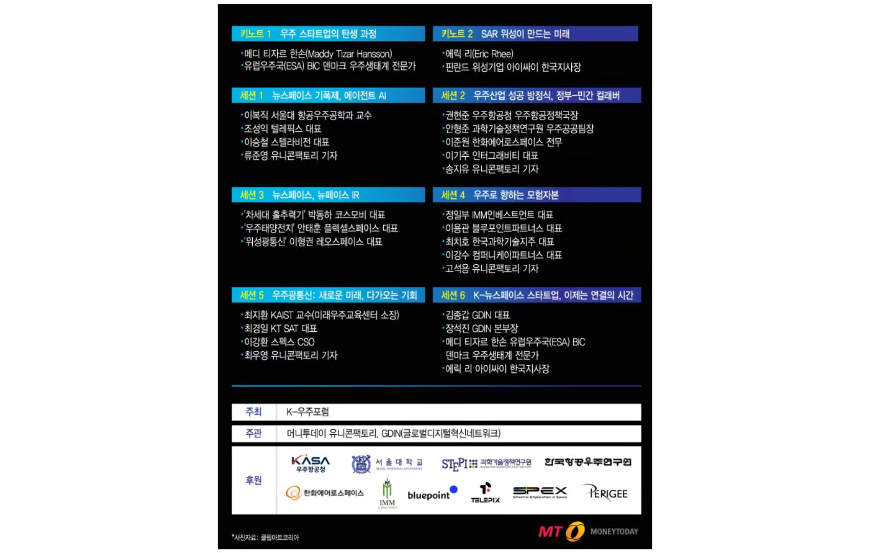 トークコンサートに出るのは、Hanwha Aerospace(ハンファエアロスペース)、KT SAT、TelePIX(テレピックス)、Stellarvision(ステラビジョン)、InterGravity Technologies(インターグラビティテクノロジーズ)、SPECS(スペックス)、ICEYE(アイサイ)など韓国内外の宇宙先導企業とESA(欧州宇宙局)、宇宙航空庁、カスタマー政策、科学技術政策GDIN(グローバルデジタル革新ネットワーク)などとなる。また、IMM Investment(IMMインベストメント)、Company K Partners(カンパニーケKパートナーズ)、Bluepoint Partners(ブルーポイントパートナーズ)、韓国科学技術持株などベンチャーキャピタル(VC)やcosmo bee(コスモビー)、FLEXELL SPACE(フレクセルスペース)、LeO SPACE(レオスペース)などの初期スタートアップも参加する。