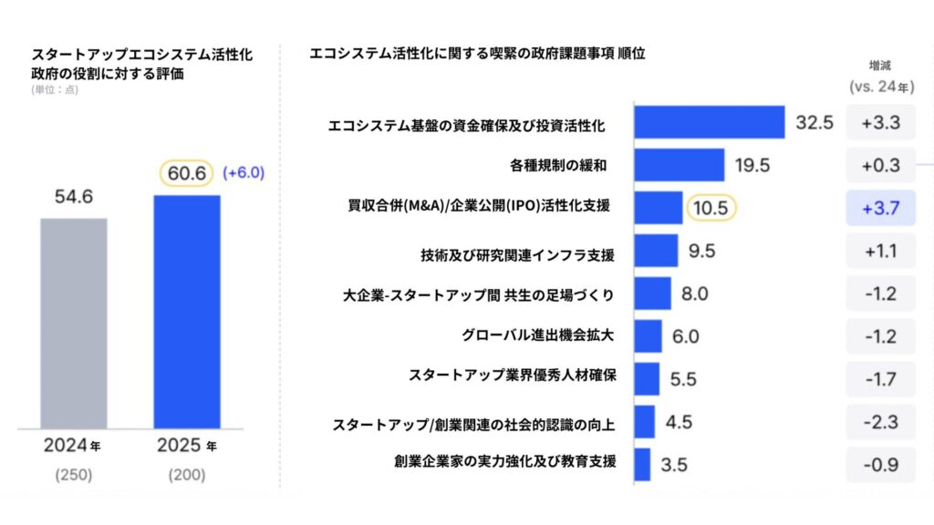 創業者が喫緊の政府課題として挙げた項目は「エコシステム基盤の資金確保及び投資活性化」(32.5%)、「各種規制の緩和」(19.5%)、「M&A・IPO活性化支援」(10.5%)の順に多かった。特にM&A・IPO関連の回答は前年比3.7ポイント増加し、回収市場の活性化に対する期待が大きくなっていることを示した。