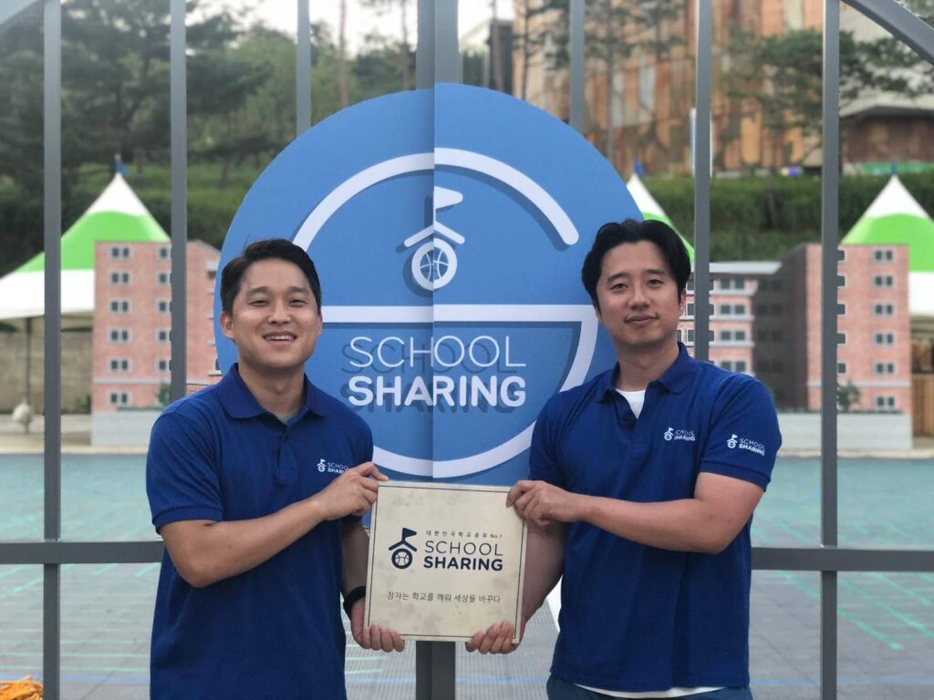 共同創業者のチェ・ヘフンCOOとパク・サンジュン代表が「SCHOOL SHARING(スクールシェアリング)」というプロジェクトパネルを掲げる様子。 /Share.IT