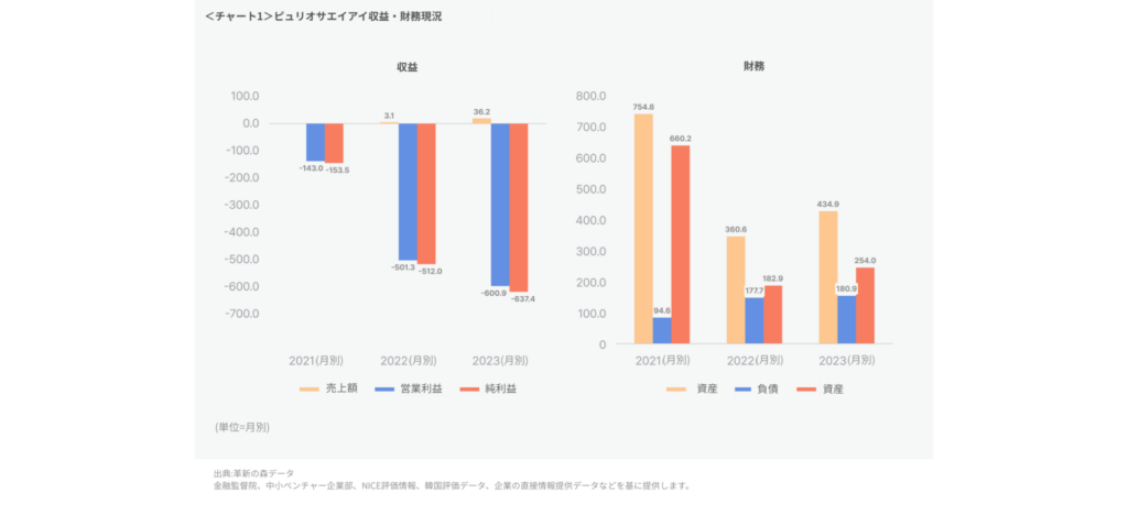 資産の面でも2021年に755億ウォン(約83.05億円)から一時的に2022年に361億ウォン(約39.71億円)に減少したが、2023年には再び435億ウォン(約47.85億円)に増加した。2022年の資産の減少は、大規模なR&D投資による現金の枯渇を反映していると見られ、2023年の資産の増加は、Series-C資金調達の過程で一部の資金が流入した影響と判断される。