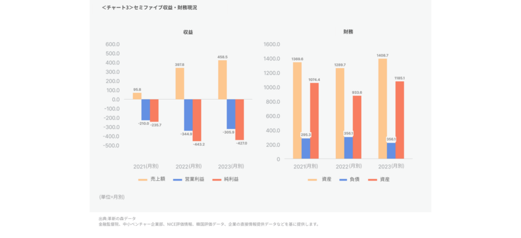 特に注目すべき点は、売上総利益が2022年-6.4億ウォン(約7000万円)から2023年74.9億ウォン(約8.2億円)に大きく改善された点であり、これはビジネスモデルが徐々に安定化していることを示唆している。営業損失も2022年-344.9億ウォン(約37.9億円)から2023年-305.9億ウォン(約33.6億円)に減少し、EBITDA(利息、税金、減価償却費、無形資産償却費差引前営業利益)も2022年-399.2億ウォン(約43.9億円)から2023年-357.5億ウォン(約39.3億円)に改善した。このような財務指標の改善は、SEMIFIVEが継続的なR&D投資にもかかわらず収益性が改善されていると判断できる。