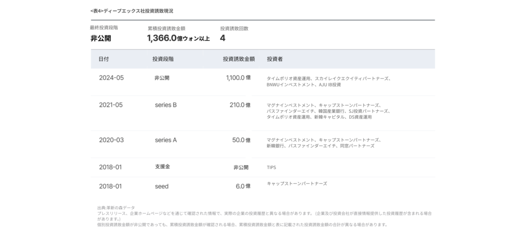 2024年5月に行われたSeries-C投資ラウンドで約1,100億ウォン(約121億円)規模の新規投資で資金調達を行った。 「Capstone Partners(キャップストーンパートナーズ)」のイグジット(回収)事例を見ると、投資金イグジットマルチプルが約13倍に達する点も、DEEPXの企業価値が急激に上昇した要因だと予想することができる。企業価値約7,300億ウォン(約803億円)水準の評価は、現在の売上高と収益性ではなく、技術力、成長可能性、市場支配の可能性などを考慮した価値評価であることを示唆している。