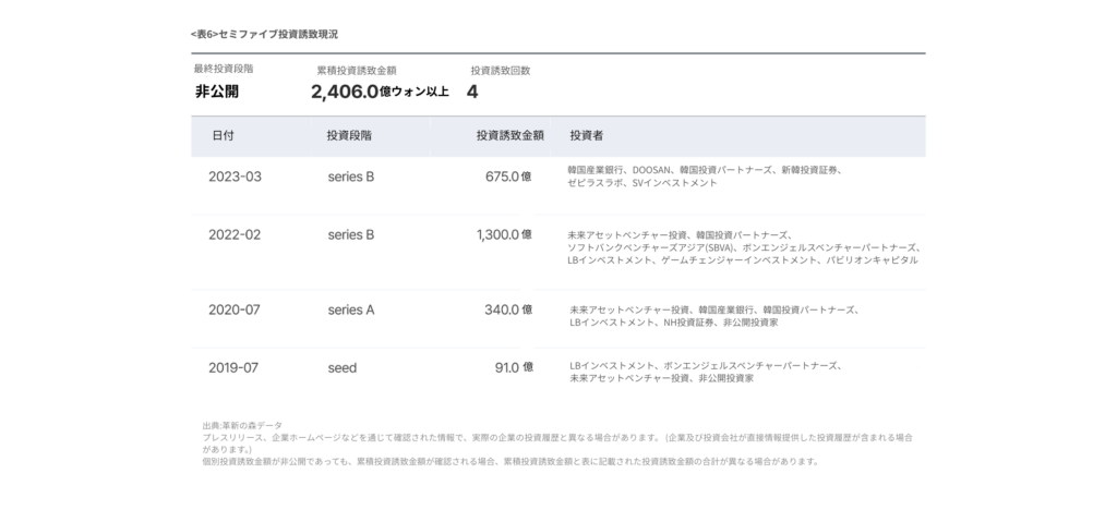 2024年5月、1,100億ウォン(約121億円)規模のSeries-C資金調達には「TIME FOLIO(タイムフォリオ資産運用)」、「Skylake Equity Partners(スカイレイクエクイティパートナーズ)」、「BNW Investment(BNWインベストメント)」、「AJU IB INVESTMENT(アジュIB投資)」などプライベートエクイティファンド機関が参加した。