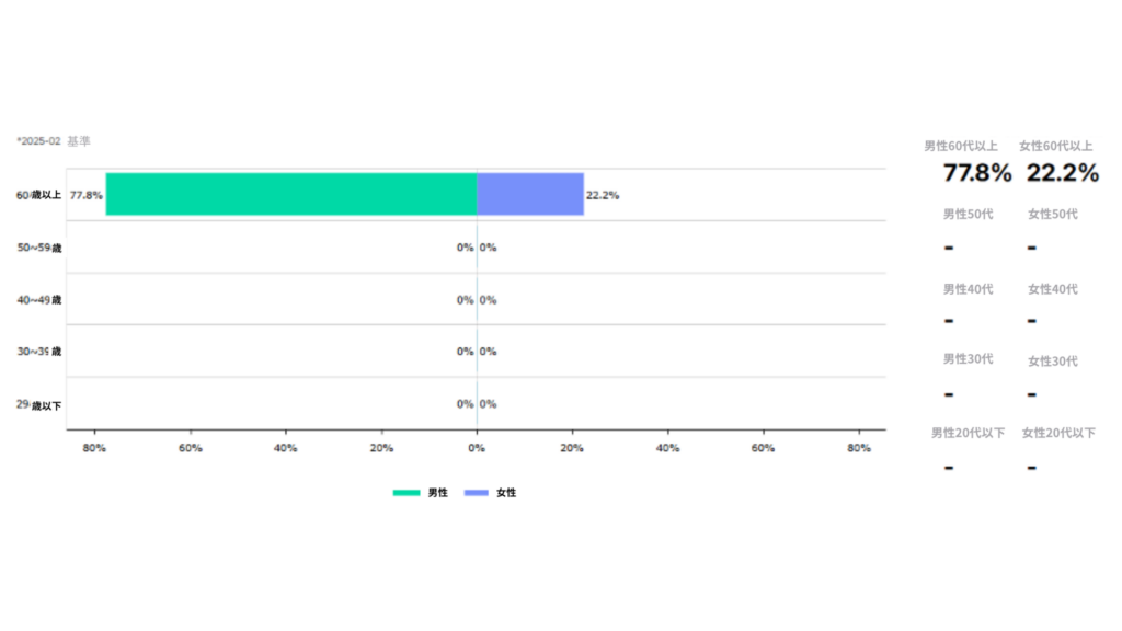 60代以上の消費者タイプが100%でした。女性に比べて男性消費者が圧倒的に多くなっています。