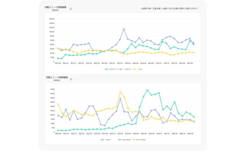 次に2024年を超え、2025年現在の状況を推論するため INNOFOREST2.0の企業比較機能を活用して企業別のMUV(ユニークユーザー数)の変化を見てみました。