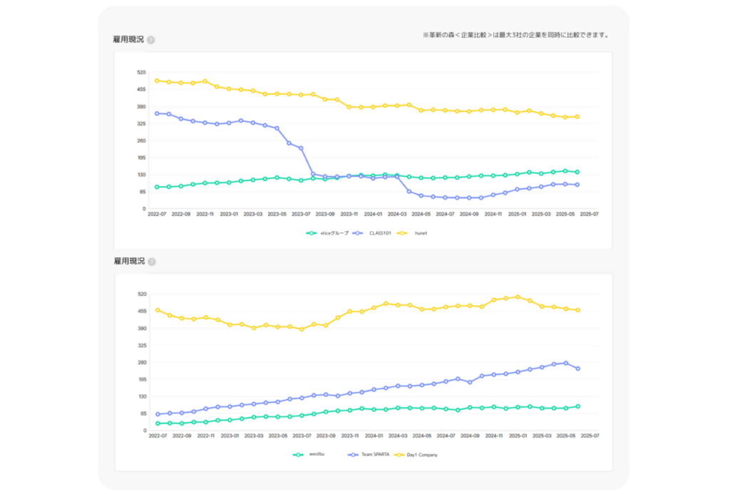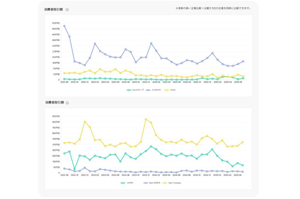 2024年と2025年を比較するとCLASS101、eliceグループ、hunetは同様の傾向にありましたがweolbu、Team SPARTA、Day 1 Companyは下落する姿を見せていました。