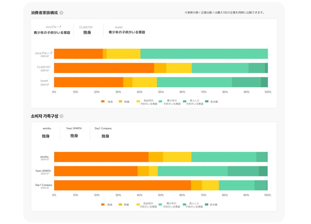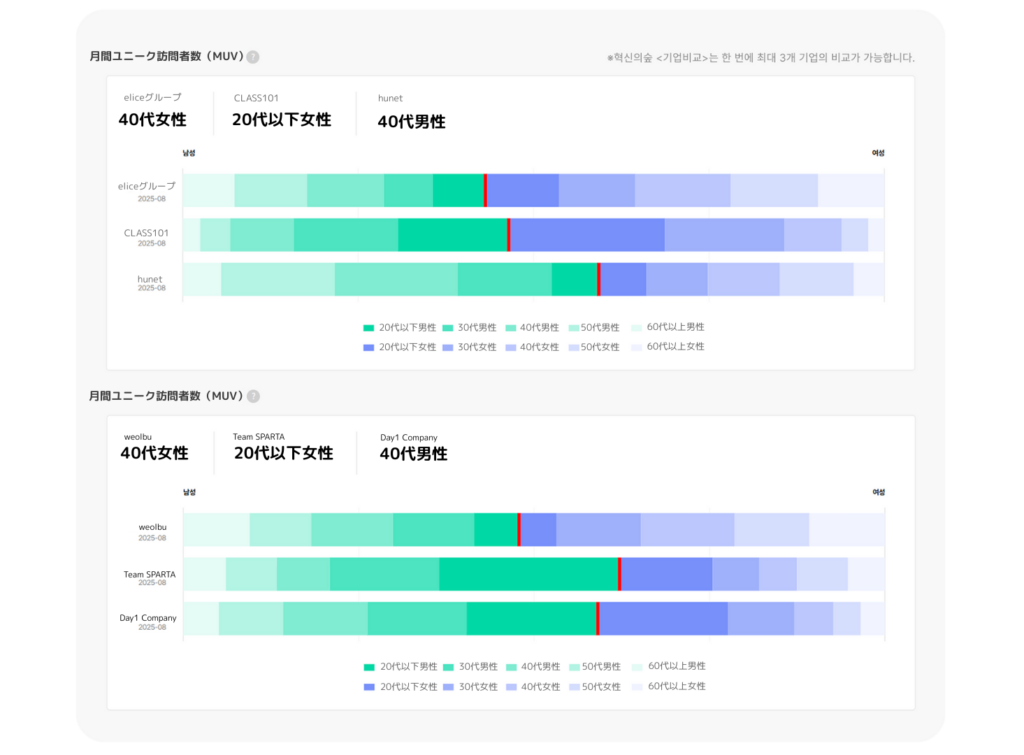 CLASS101、Team SPARTA、Day 1 Companyの場合20代以下の男性が最も多く、eliceグループとweolbuは40代の女性、hunetの場合、40代の男性が多くなりました。