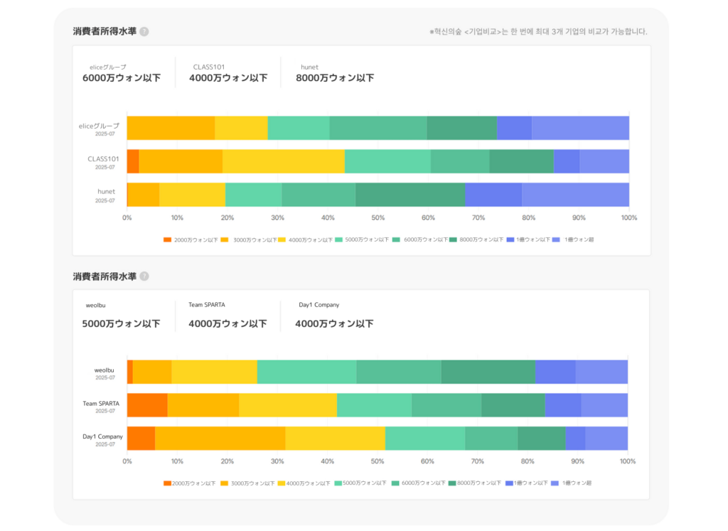 取引額データを具体的に見るとweolbuは5000万ウォン(約530万円)以下の1人暮らし世帯、Day 1 Companyは3000万ウォン(約320万円)以下の1人暮らし世帯、CLASS101は4000万ウォン(約425万円)以下の1人暮らし世帯が多くなりました。
