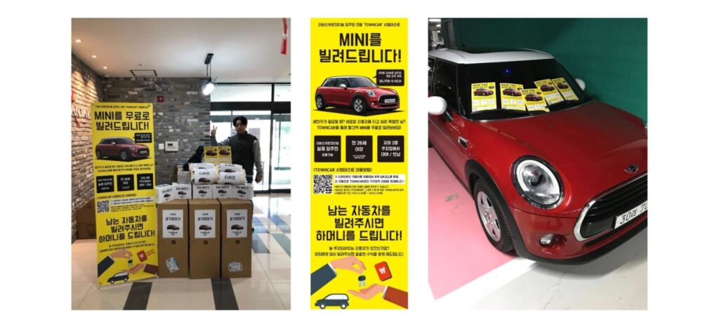 同じアパートに住んでいる人から赤いミニを借りることができるという内容のチラシを500枚印刷し、全世帯に配って回りました。同時に、エレベーターにも貼り出しました。しばらくして約100件、KakaoTalk(カカオトーク)の問い合わせが来て、そのうち20件のレンタルを実現しました。