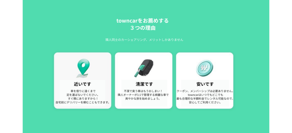 車を借りたい人の立場で、towncarを利用したときに得られる価値は明確です。