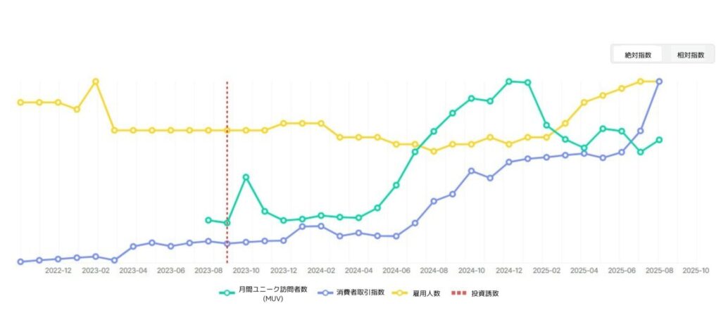 24年5月に当社は投資を受けました。マーケティングに活用できるリソースが増え、知名度を高めるためのキャンペーンへの投資をたくさんしました。投資を受ける前には、オーナーからの問い合わせを生み出すコンバージョンCPAキャンペーンに集中していたとすると、その頃からは、towncarというサービス自体を知らせる映像トラフィックキャンペーンとYouTubeコンテンツ広告などを一緒に行い始めました。このような知名度キャンペーンが直接の成果につながるかについては、いつも悩んでいますが、成長するグラフを見ると、確かにこれが変化の始まりだったと感じています。