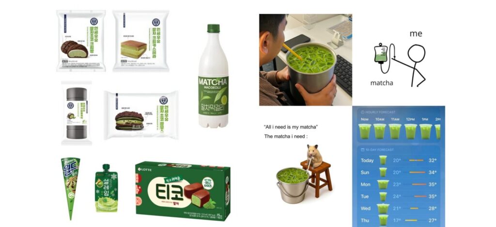 これらのコンテンツは特にZ世代を中心に活発に消費されました。インフルエンサーの消費を追う「Ditto(ディット)消費」というここ数年間の主要消費トレンドに支えられ、抹茶の人気は今年最高潮を迎えました。抹茶が「Ditto消費」の核心ターゲットテーマとして位置づけられ、「抹茶」「抹茶粉末」「抹茶デザート」など関連キーワードが一斉に急成長し、有名F&Bブランドも市場先取りのため抹茶を活用した新製品を競争的に発売する様相を見せました。これにより、様々な抹茶新製品とともに関連ミーム(meme)も登場し、大きな話題となりました。