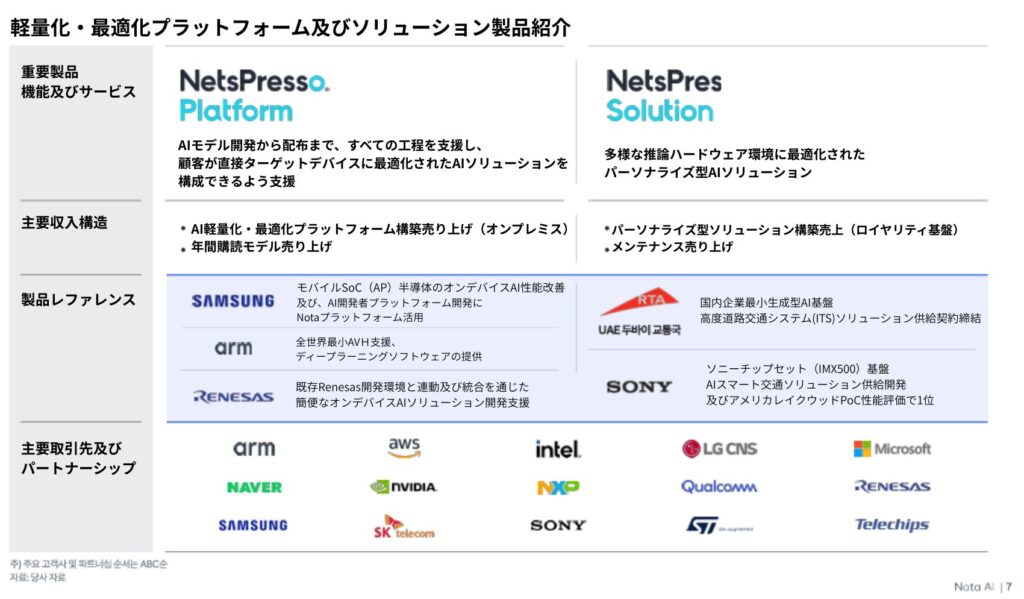 → NetsPresso Platform:AIモデルの開発から展開まで、全プロセスを自動化するプラットフォームで、主にSAMSUNG(サムスン電子)、ARM、RENESASなどのグローバル半導体企業や大企業にライセンス形態で供給されています。