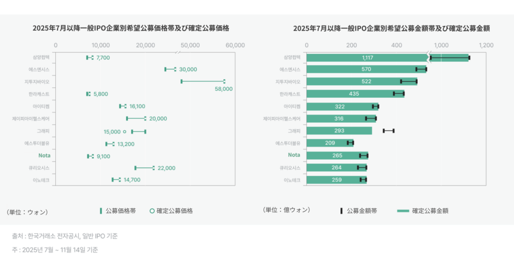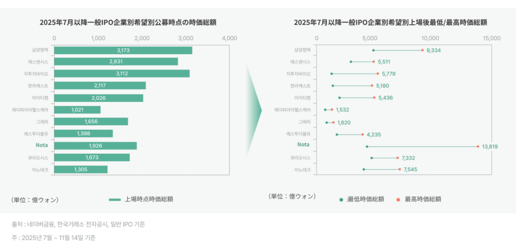 昨年末、技術成績評価を通過したNotaは2025年5月22日、未来アセット証券を上場主管社としてKOSDAQ上場審査を請求し、7月29日審査承認を経て、10月14日から20日まで需要予測日程を進めました。最終的に11月3日にKOSDAQ新規上場を完了しました。