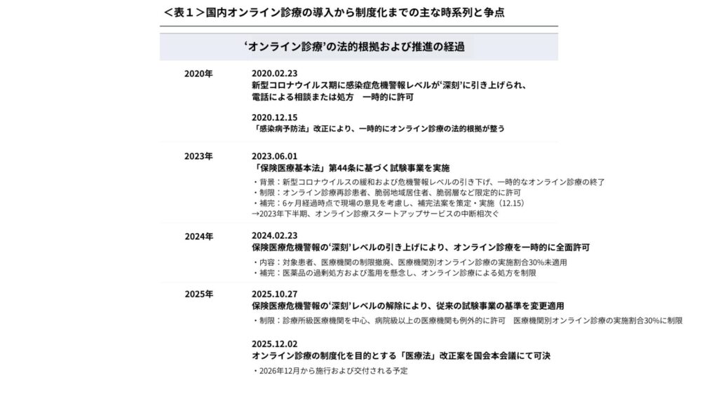 こうした動きを受け、2025年12月2日、国会本会議においてオンライン診療の制度化を目的とする「医療法」改正案が可決されました。改正案には4つの基本原則が反映されています。対面診療を原則とすること、診療所級医療機関を中心とすること、再診患者を中心とすること、そしてオンライン診療を専業とする機関を認めないことです。補完的手段としての位置づけにとどまるという限界はあるものの、オンライン診療は法的根拠を持つ事業として正式に認められることになりました。