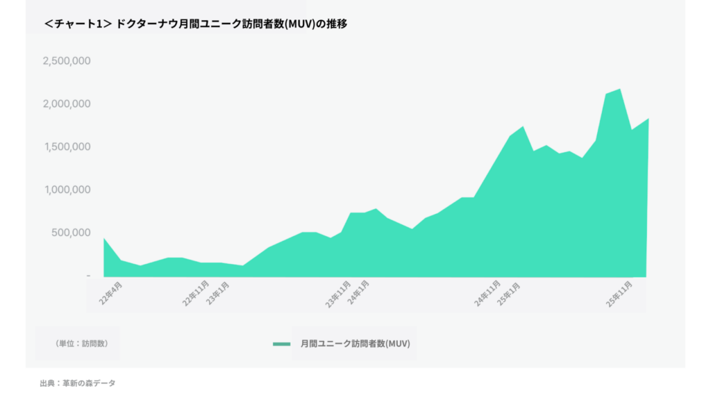 実際に、韓国を代表するオンライン診療プラットフォーム企業dr.nowのMUV(月間ユニーク訪問者数)の推移から、法規制の動向と連動して成長していることが分かります。2024年以降、同社のMUVは急速な上昇カーブを描き、200万人規模にまで達しています。