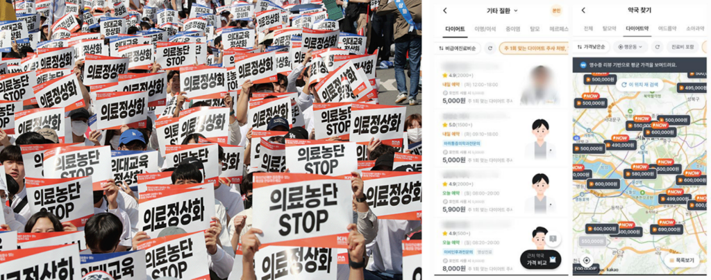 〈左〉医学部定員拡大をめぐる医政対立のデモ/朝鮮日報、〈右〉ウゴービを処方するオンライン診療アプリの画面/韓国日報