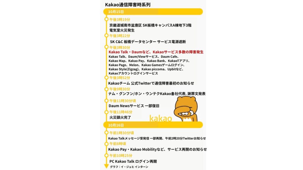 今回の火災事故は、2022年に韓国人の必須ITサービスであったKakao(カカオ)がデータセンター火災によって、127時間中断された、いわゆる「Kakao火災通信障害」と同じくリチウムイオンバッテリー発火が原因と現在推定されています。