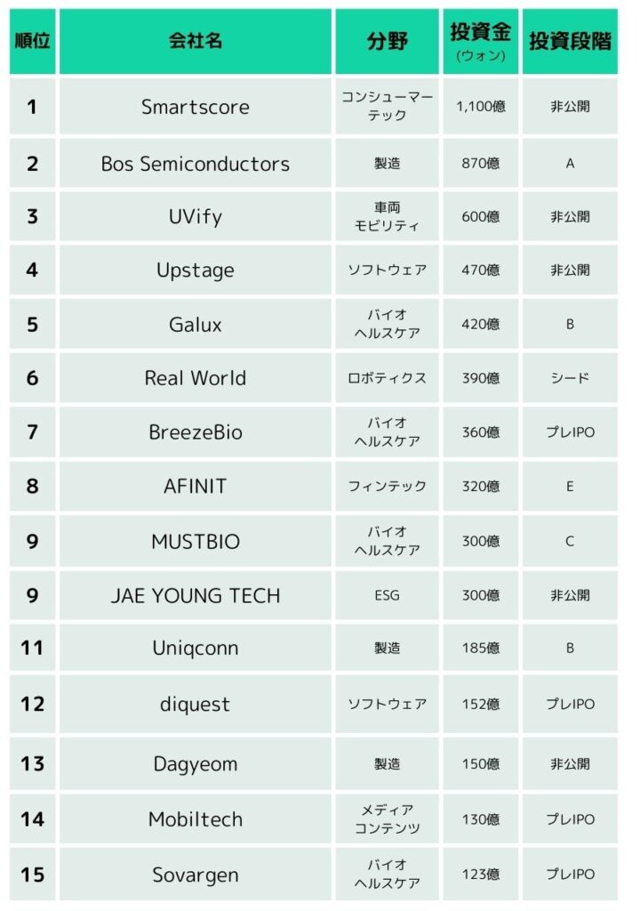 韓国スタートアップ資金調達TOP15