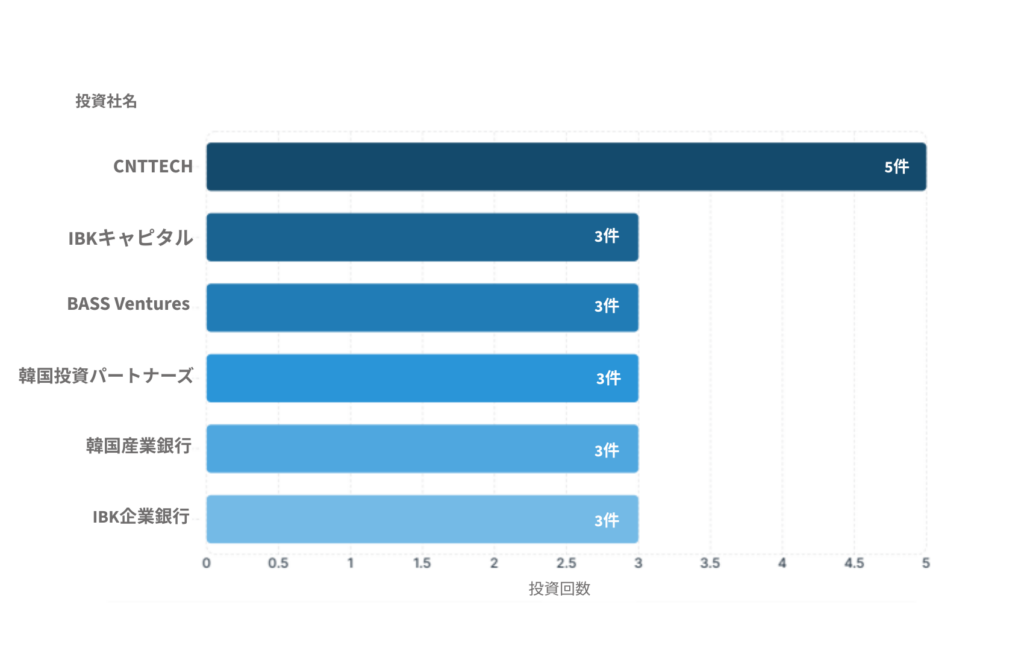2月の1ヶ月間、韓国のスタートアップ市場で最も活発な動きを見せた投資会社はCNTTECH(シーエヌティーテック)だった。CNTTECHは5件の投資を断行し、初期スタートアップの発掘を先行して進めた。これに、IBKキャピタル、BASS Ventures(ベースベンチャーズ)、韓国投資パートナーズ、韓国産業銀行、IBK企業銀行がそれぞれ3件ずつ投資を行った。これらの投資会社はバイオ、ソフトウェア、フィンテックなど、様々な分野の有望なスタートアップに資金を供給して市場活性化を牽引(けんいん)した。そのほか、NAVER D2SF、Smilegate Investment(スマイルゲートインベストメント)、SBI Investment(エスビーアイインベストメント)など、主要ベンチャーキャピタル(VC)とアクセラレーターもそれぞれ2件以上の投資を行い、投資意欲を見せた。