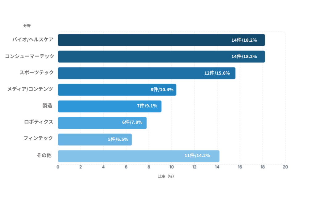 今月の投資推移を分野別に見ると、特定分野に資本が集中する偏り現象とともに、ディープテック中心の質的成長が同時に観察された。バイオ/ヘルスケアとコンシューマーテックがそれぞれ18.2%を占め、最も活発に投資が行われた。これに、ソフトウェア分野が15.6%で続き、メディア/コンテンツ(10.4%)や製造(9.1%)分野も活発だった。中でも、人工知能(AI)ベースのソフトウェアソリューションと、ヘルスケア技術企業への資本流入が際立った。