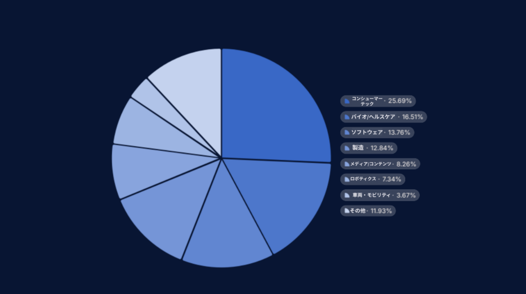 件数はコンシューマーテックが最も多かったが、大規模な資金が集中したのはAI半導体及びエネルギーイノベーションを含む製造とバイオ分野だった。