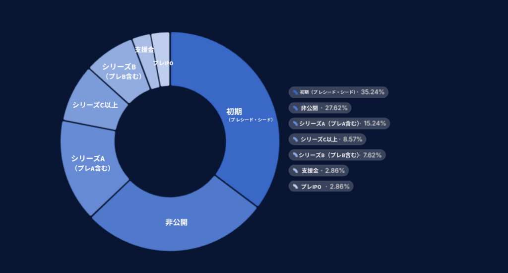 投資ラウンド別にみると、全体の42.2%がシード、プレシード、プレシリーズAなど、初期投資に集中した。金額が非公開の投資を除いたシリーズラウンドの中では、シリーズAが10.1%で最も多かった。シリーズC・D、プレIPOなど、イグジットを目前にした後期投資は11.0%で、件数自体は少なかったものの、投資全体の半分を超えるブラックホールの役割を果たした。
